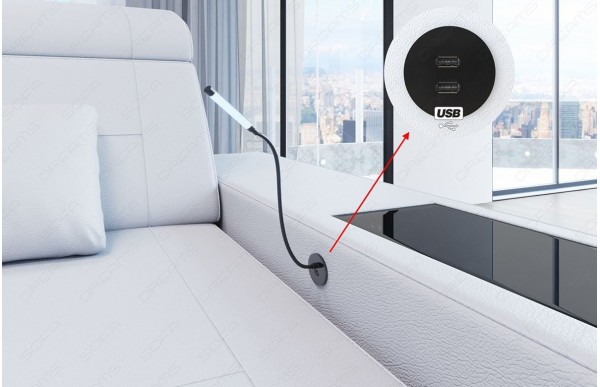 Do każdej sofy można zamówić jeden z dwóch dodatkowych elementów. Do wyboru oferujemy Ci niezwykle pojemne miejsce do przechowywania przedmiotów, chłodzące uchwyty na kubki, indukcyjna stacja ładowania i porty USB.